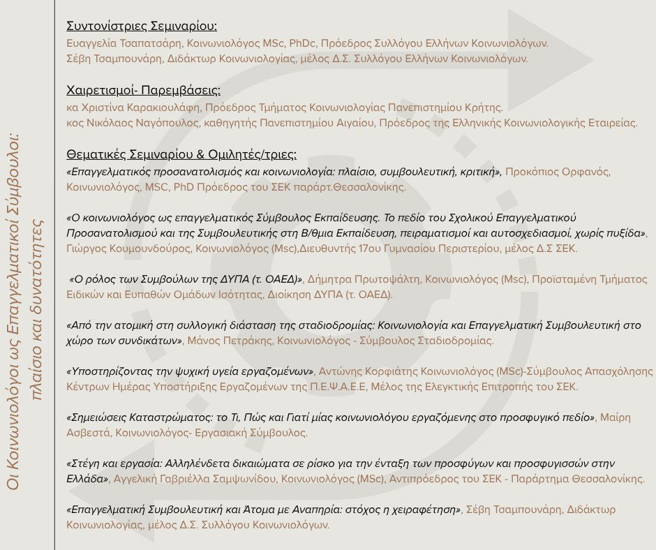 Με μεγάλη επιτυχία και συμμετοχή πραγματοποιήθηκε χθες το επιμορφωτικό σεμινάριο του ΣΕΚ με θέμα: «Οι κοινωνιολόγοι ως επαγγελματικοί σύμβουλοι: πλαίσιο και δυνατότητες». Ευχαριστούμε πολύ όλους/ες για τη συμμετοχή αλλά και τους ομιλητές/τριες, οι οποίοι/ες ανέλυσαν το πλαίσιο της επαγγελματικής συμβουλευτικής μεταφέροντας την εμπειρία τους από το πεδίο της εφαρμοσμένης κοινωνιολογίας-της εκπαίδευσης, της κοινωνιολογίας των συνδικάτων, των δημόσιων πολιτικών απασχόλησης, της αναπηρίας, της ψυχικής υγείας, του προσφυγικού, του φύλου και της στέγασης: τον Ακη Ορφανό, Γιώργο Κουμουνδούρο, Μάνο Πετράκη, Δήμητρα Πρωτοψάλτη, Αντώνη Κορφιάτη, Μαρία Ασβεστά, Σέβη Τσαμπουνάρη, Γαβριέλλα Σαμψωνίδου. Το Σεμινάριο χαιρέτισαν η κα Χριστίνα Καρακιουλάφη, Πρόεδρος Τμήματος Κοινωνιολογίας Κρήτης και ο κος Νίκος Ναγόπουλος, Πρόεδρος ΕΚΕ, Καθηγητής Κοινωνιολογίας Πανεπιστημίου Αιγαίου, τους οποίους ευχαριστούμε θερμά. Το Σεμινάριο συντόνισαν η Πρόεδρος του ΣΕΚ Ευαγγελία Τσαπατσάρη και η Σέβη Τσαμπουνάρη Μέλος ΔΣ, Υπεύθυνη Συνεδρίων και Εκπαιδευτικών Δράσεων.